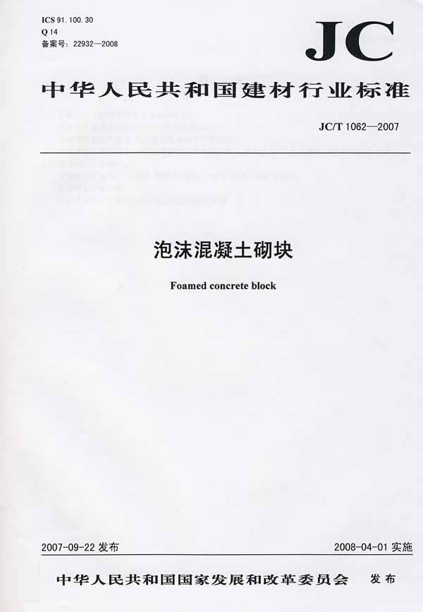 施工單位應(yīng)當(dāng)對(duì)進(jìn)入施工現(xiàn)場(chǎng)的墻體材料、保溫材料、門(mén)窗、采暖制冷系統(tǒng)和照明設(shè)備進(jìn)行檢驗(yàn),不符合施工圖設(shè)計(jì)文件要求的,不得使用! 中華人民共和國(guó)建材行業(yè)標(biāo)準(zhǔn) JC/T1062-2007 泡沫混凝土砌塊 2008-04-01實(shí)施 國(guó)家標(biāo)準(zhǔn) |